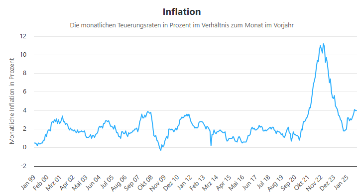 Laut Schnellschätzung der Statistik Austria lag die Inflationsrate im Oktober 2025 bei 4,0 Prozent und damit auf dem gleichen Niveau wie im September. Gegenüber dem Vormonat stieg das allgemeine Preisniveau um 0,4 Prozent.
