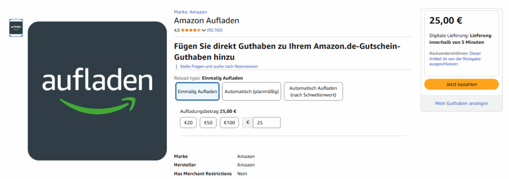 Getestet wurde es mit einer Amazon Guthabenaufladung über 25 Euro, was 2,50 Maximal-Cashback ausmacht.