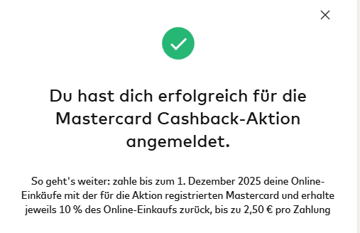 Im Zeitraum vom 1. Oktober bis 1. Dezember 2025 bietet Mastercard eine Cashback-Aktion für Online-Zahlungen an. Kundinnen und Kunden, die ihre Mastercard Debit- oder Kreditkarte für Einkäufe im Internet einsetzen, können dabei bis zu 25 Euro zurückerhalten.